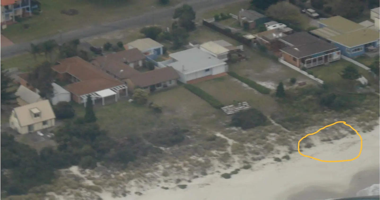 An additional observation that we believe is relevant is that every incident of storm erosion that we have witnessed over the last 25 years has cut the beach to the same spot. That spot can be seen in this aerial photo taken in April 2010 showing where the vegetation and dunes have always ended. It’s at the ‘thinning out’ point highlighted in yellow that the erosion happens. Every time.